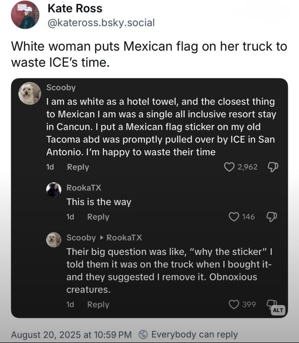 I know you don't understand empathy, and you don't feel shame, but it's your willingness to accept the jackbooted authoritarians who got us here. You are happy to give up some of your rights if it impacts the brown people a little more, so we are willing to give up a few minutes of our time to waste the time of your senseless government bigots and be sure that time isn't spent targeting marginalized people.